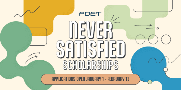 From now until February 13, students across the country are invited to apply for POET’s Never Satisfied Scholarship Program. The scholarships are designed for those who refuse to settle for “good enough” and who share POET’s passion for creating a brighter future.